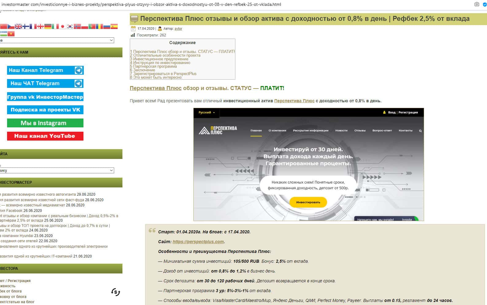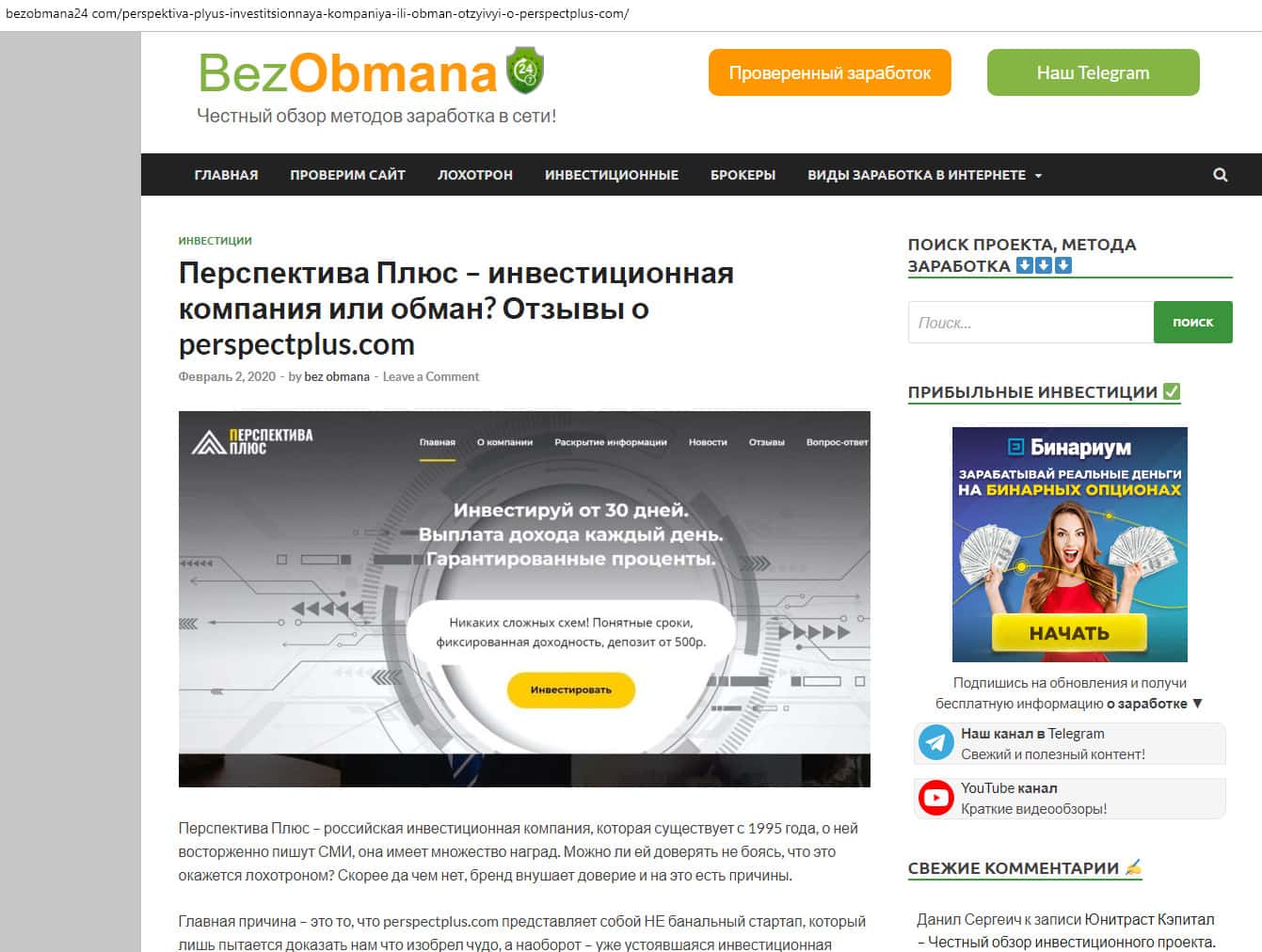 На сайте bezobmana24 com был разобран хайп-проект Перспектива Плюс, который в последнее время набирает популярность. Автор указывает на то, что этот проект ещё не был замечен в воровстве денег своих клиентов, но это ещё не значит, что он не сделает этого через некоторое время, при этом документация на сайте вполне позволяет ему это сделать.