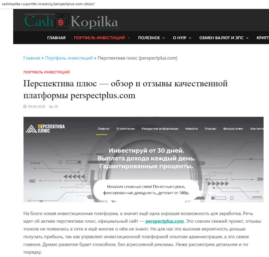 На сайте cashkopilka ru автор статьи рассуждает о прелестях работы с мошенниками Перспектива Плюс. Самое интересное, что статья полностью скопирована с других ресурсов, а это значит, что данный пост просто заранее был подготовлен конторой Перспектива Плюс, чтобы вскоре начать распространять его по интернет-ресурсам с целью привлечения клиентов.