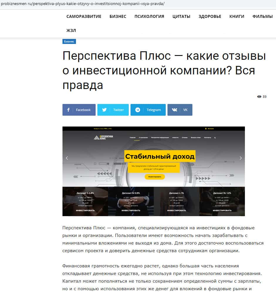 "Перспектива Плюс — какие отзывы о инвестиционной компании? Вся правда" - такой заголовок у статьи на веб-ресурсе probiznesmen ru, при этом ни о какой правде в самом обзоре речи и не идёт. Ещё один подкупленный обзор, в котором автор не стыдится восхваляться этой мошеннической кухней и при этом толкать наивных людей инвестировать в этот проект.