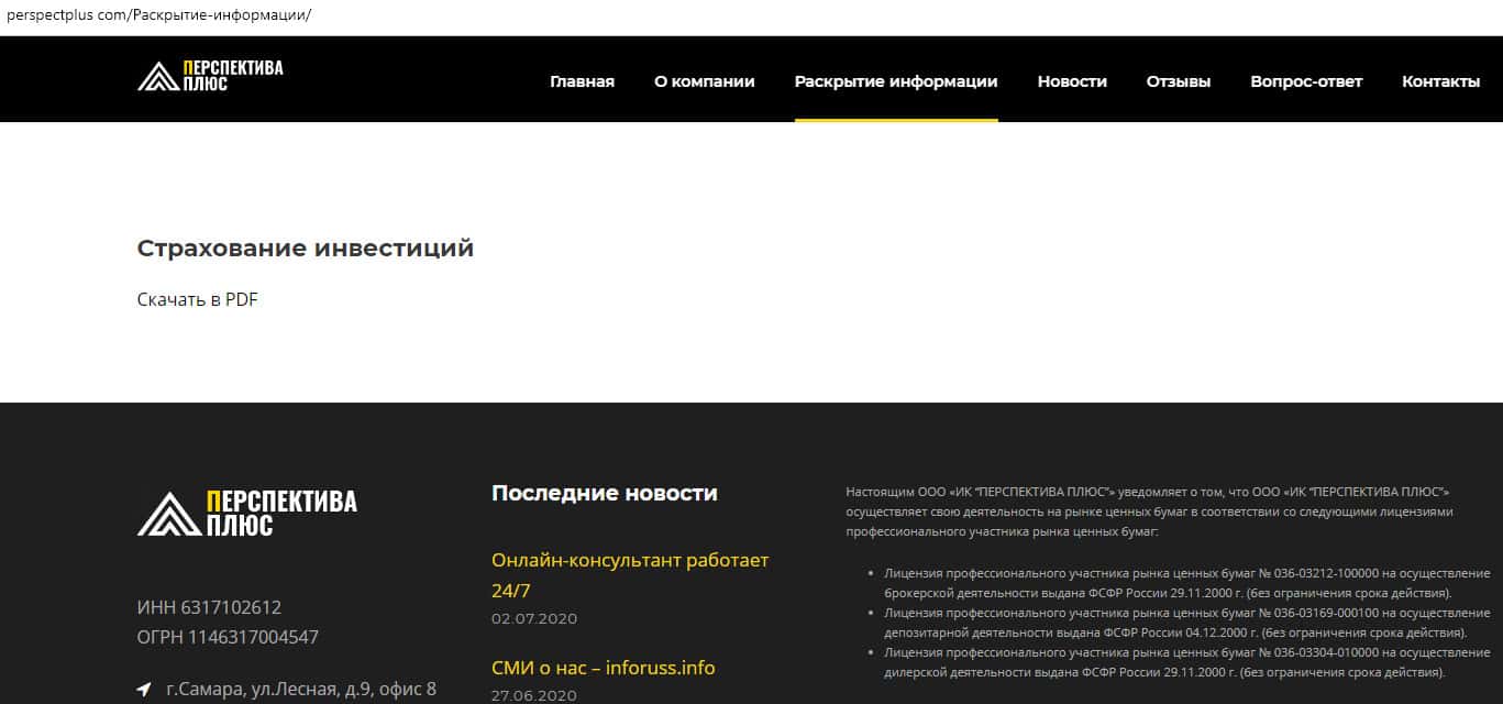На сайте этой мошеннической кухни написано, что у Перспектива Плюс есть лицензии и дают даже информацию о данных лицензиях. В интернете никакой информации о данных лицензиях нет. То бишь, все слова Перспектива Плюс их честности и прибыльности - пустышка, ни одно слово не соответствует реальности, хотя они могли бы выложить копию лицензию.
