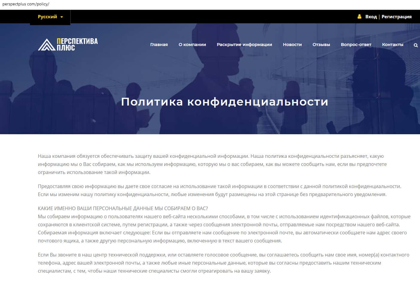 - Политика конфиденциальности мошеннической инвест-конторе Перспектива Плюс