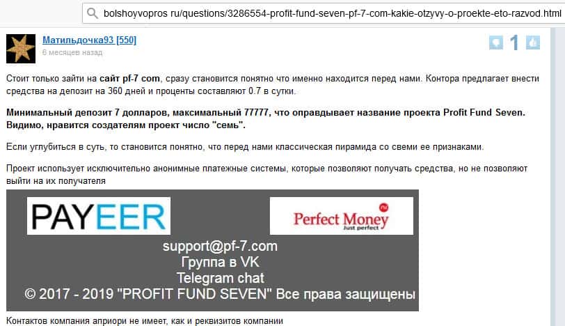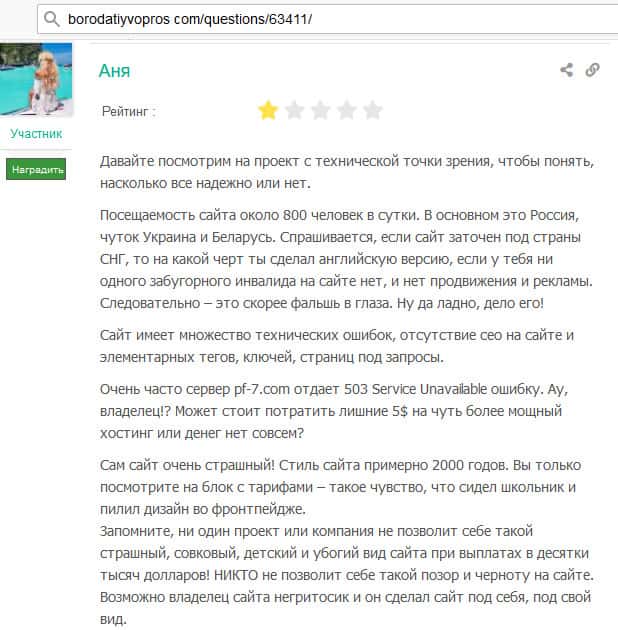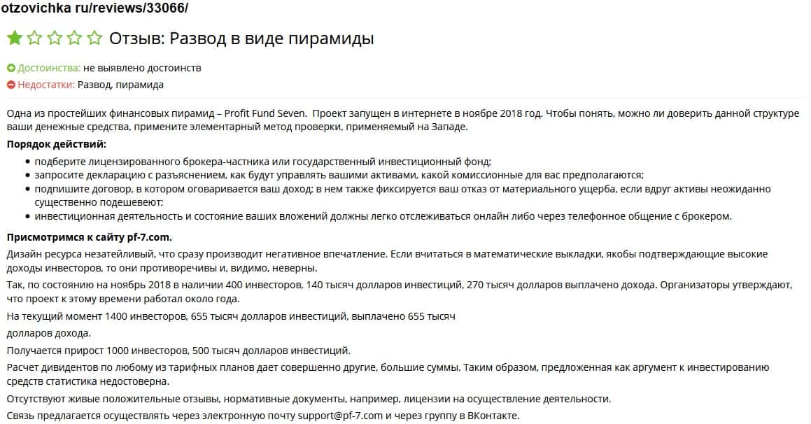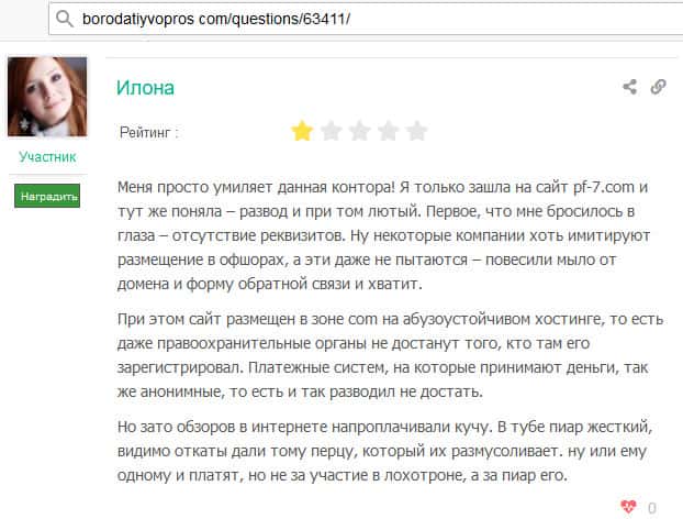 Если присмотреться к сайту ПФ-7, то становится понятно, что это очередной лохотрон. Тем не менее. Стоит только посмотреть на его посещаемость, чтобы понять, в чем дело. Он совершенно не соответствует тому, о чем пишется на страницах его сайта. Так что лучше всего будет с ними просто не связываться.