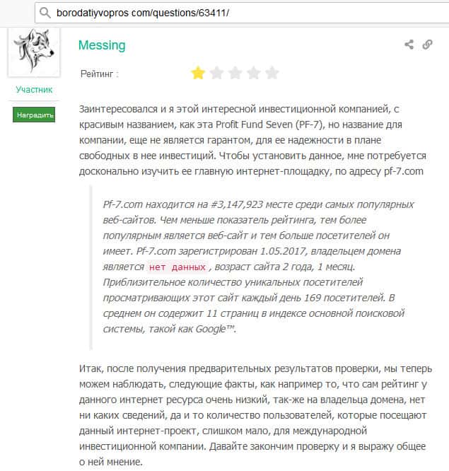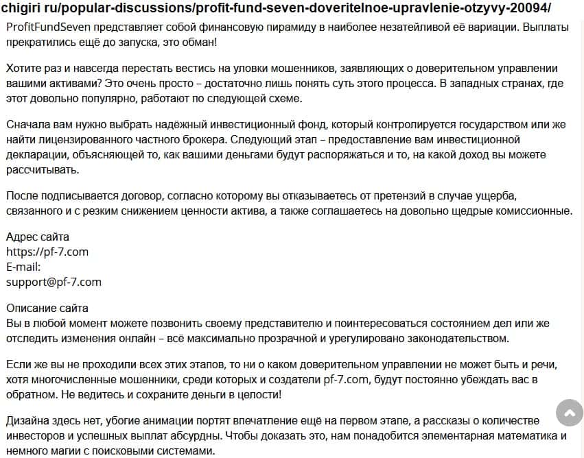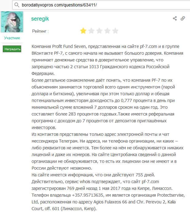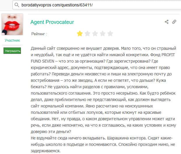 Оценка лохотрона PROFIT FUND SEVEN на авторитетном источнике