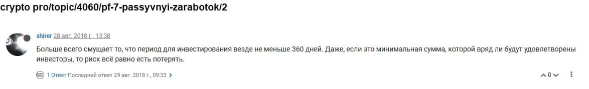 Нельзя доверять конторе ПФ-7, потому что если посмотреть на то общее количество негатива, что есть в отзывах о них в сети, а также хорошенько промониторить черные списки хайпов, то станет понятно, что к ним не стоит приближаться на расстояние пушечного выстрела. Вы просто потеряете свои деньги и все.