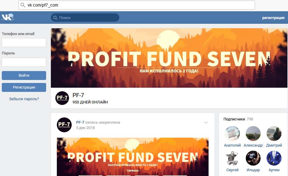 Жулики PROFIT FUND SEVEN активно используют социальные сети, чтобы привлекать в свой проект как можно больше новых лохов. Увы, но сейчас соцсети используются не только порядочными людьми, но и всякого рода жуликами. Поэтому, если вы не хотите оказаться среди кинутых, то обходите стороной следующие страницы в интернете: