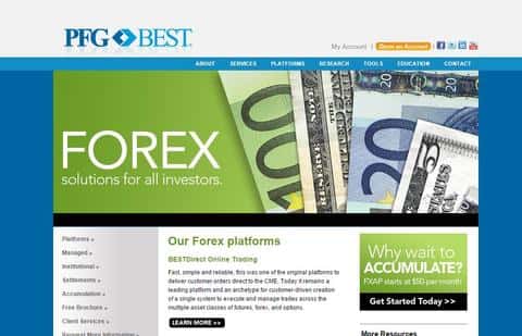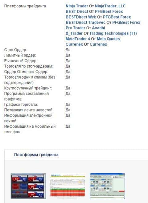 PFGBest располагает хорошими возможностями, чтобы помочь клиентам преуспеть в торговых операциях на фьючерсном и валютном рынках. Компания BEST Direct предлагает свою торговую платформу BEST Direct, в которой интегрированы торговые системы и финансовые новости. Так же к услугам клиенты круглосуточная поддержка Чикагского и Нью-Йоркского офисов. Профессиональные услуги, опыт компании и ее сотрудников, легкий доступ к дополнительной информации для любой торговой потребности, симуляции торговли для более легкого обучения торговле на рынке форекс. Это все лишь часть того, что может вам предложить PFGBest - одна из крупнейшик компаний на рынке форекс!