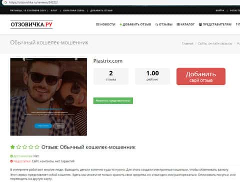 Портал otzovichka ru так же посвятил лохотрону Piastrix отдельную статью, в которой описал все аспекты данного мошеннического предприятия, а именно жуликов Пиастрикс, с которым сайт отзовичка ру определенно не рекомендует иметь дело, так как это очередной халтурный развод для наивных пользователей сети интернет. Ниже вы можете увидеть статью о шулерах Piastrix с портала otzovichka ru.