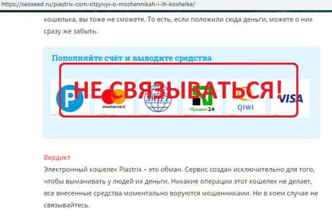 Несмотря на свою довольно низкую популярность аферистов Piastrix о них все же пишут некоторые источники сети интернет, например как портал сеосеед ру, который определенно не рекомендует иметь дело с мошенниками Пиастрикс, так как они попросту являются очередным банальным лохотроном сети интернет, о чем вы можете наглядно прочесть на изображении, расположенном ниже.
