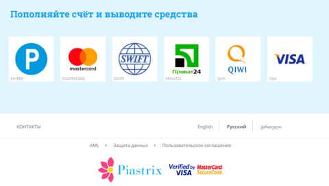 Завершается сайт у лохотрона Пиастрикс довольно сжато и кратко, что опять же говорит о крайне низком бюджете аферистов Piastrix, которые создавали свой сайт на коленке. Окончание сайта у шулеров Пиастрикс содержит в себе только лишь ссылки на различные разделы сайта жуликов Piastrix ну и банальную попытку жулья поднять себя в глазах клиента с помощью посторонних организаций.