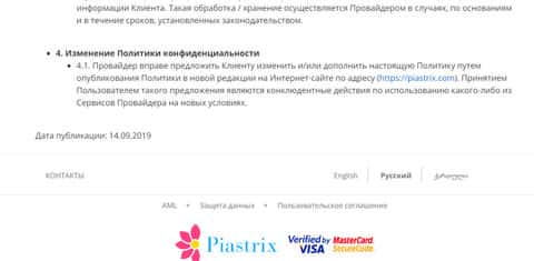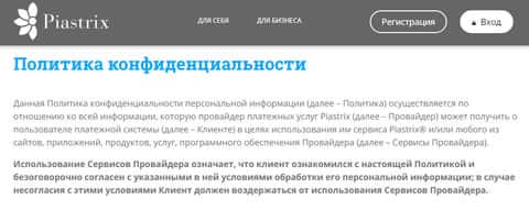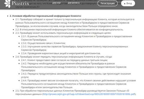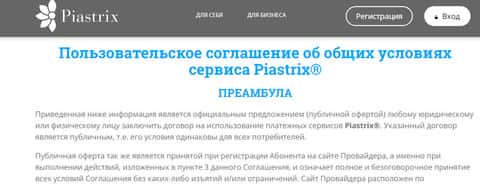- Условия сотрудничества и клиентское соглашения лохотрона Пиастрикс