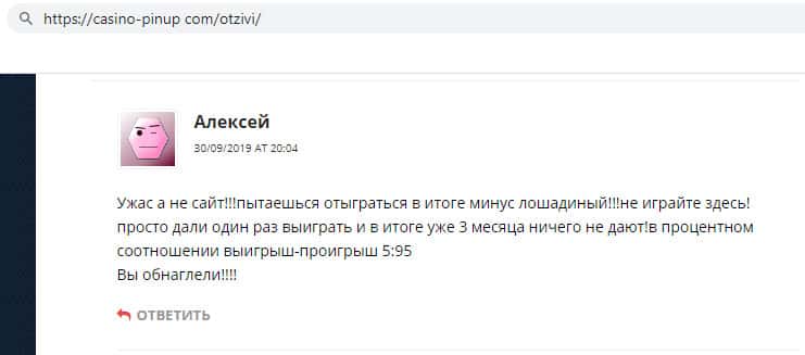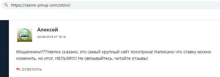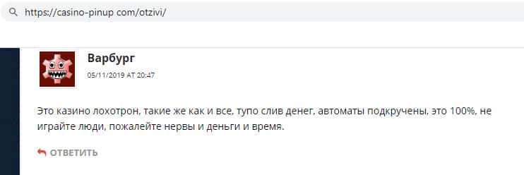 Один из пользователей в своём отзыве порекомендовал никому не лезть в лохотрон Pin-Up Casino, так как компания не позволит выиграть а будет просто отнимать деньги клиентов.