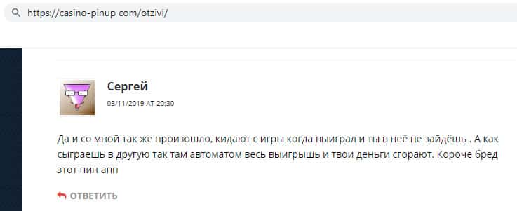 Ещё один пользователь пожаловался на то, что смог выиграть в Пин Ап Казино, но вот только после победы его тут же выкинуло, и денег он не получил, теперь не знает как обозвать казино.