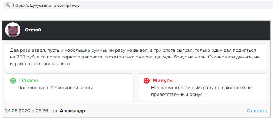 Среди отзывов о компании жуликов Pin-Up Casino мы нашли отзыв пользователя, который настойчиво не рекомендует никому играть в фальшивом казино Pin-Up Casino.