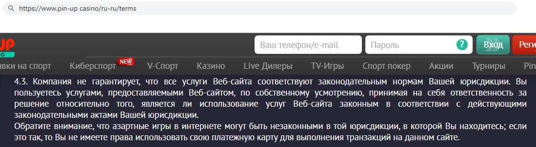 В одном из пунктов клиентского соглашения, компания кидал Pin-Up Casino прямо говорит, что её услуги могут быть незаконными, но тем не менее предоставляет их и требует за них денежные средства.