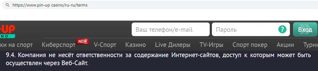 Лохотрон Пин Ап Казино указал в пользовательском соглашении, что не отвечает за информацию на сайтах, ссылки на которые находятся на главном сайте казино.