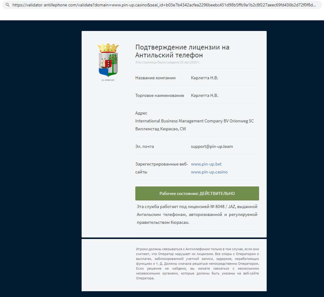 Регулятором фирмы аферистов Пин Ап Казино является Antillephone. Данный регулятор продаёт лицензии всем мошенникам и никак не гарантирует безопасность средств клиентов.