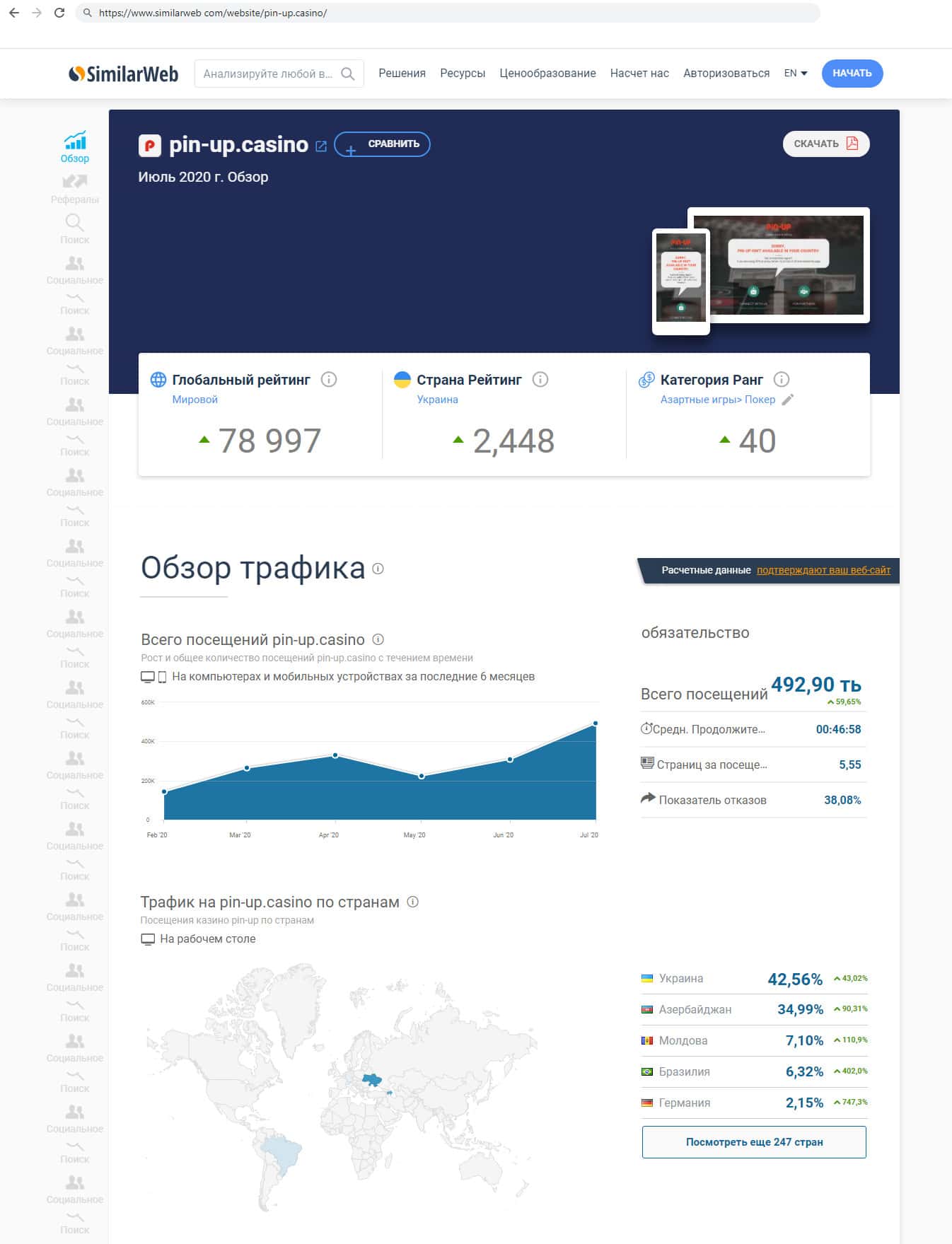 Через сайт similarweb com мы проверили трафик главного сайта кидал Pin-Up Casino. Оказалось, что основная масса клиентов лохотрона находится в Украине.