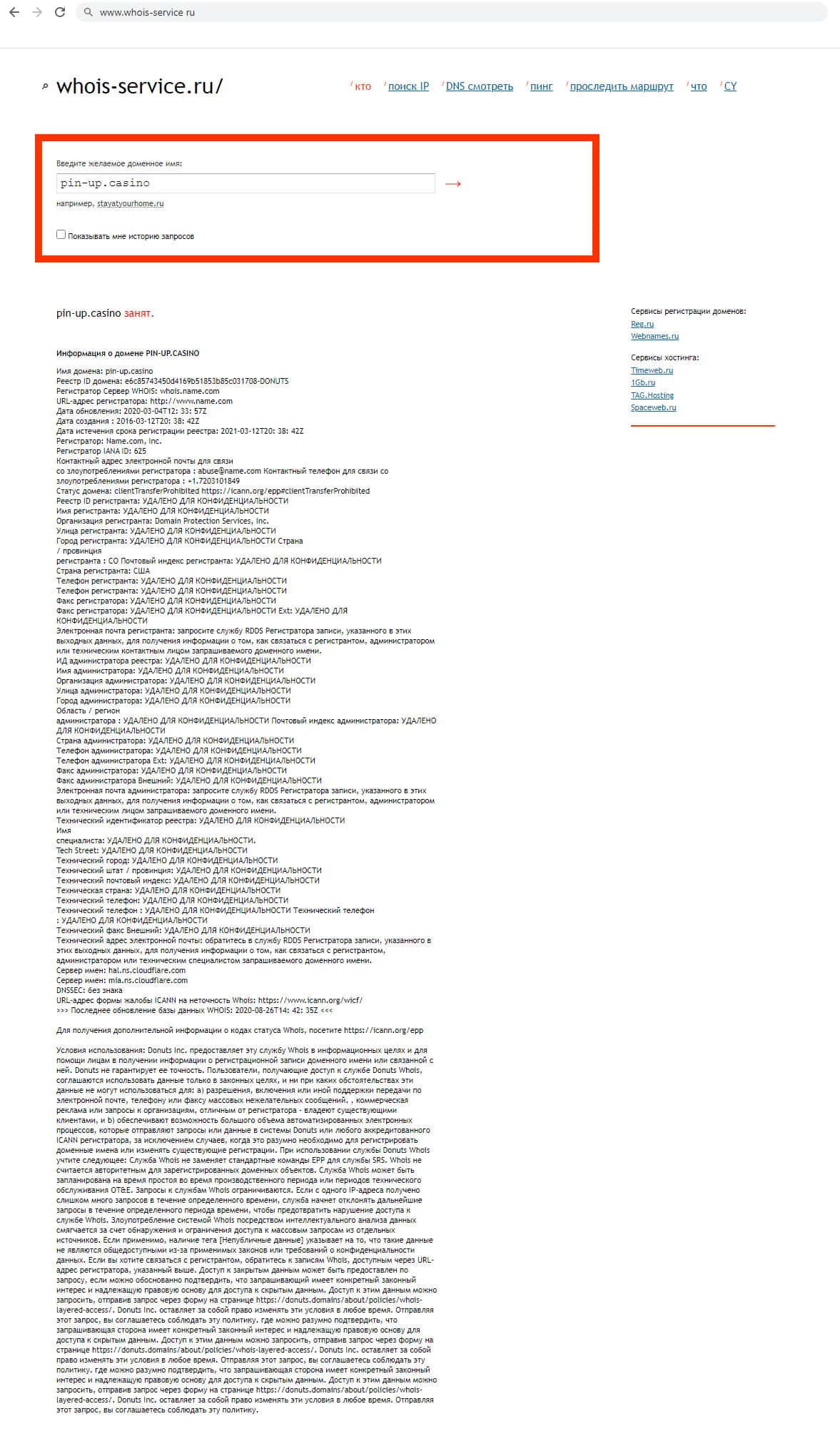 Через интернет ресурс whois-service ru, мы хотели узнать владельца домена компании кидал Pin-Up Casino, но оказалось, что фирма скрывает владельца.