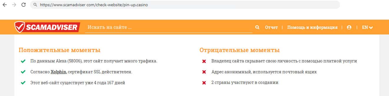 - Мнение интернет ресурса scamadviser com о недоказино Pin-Up Casino