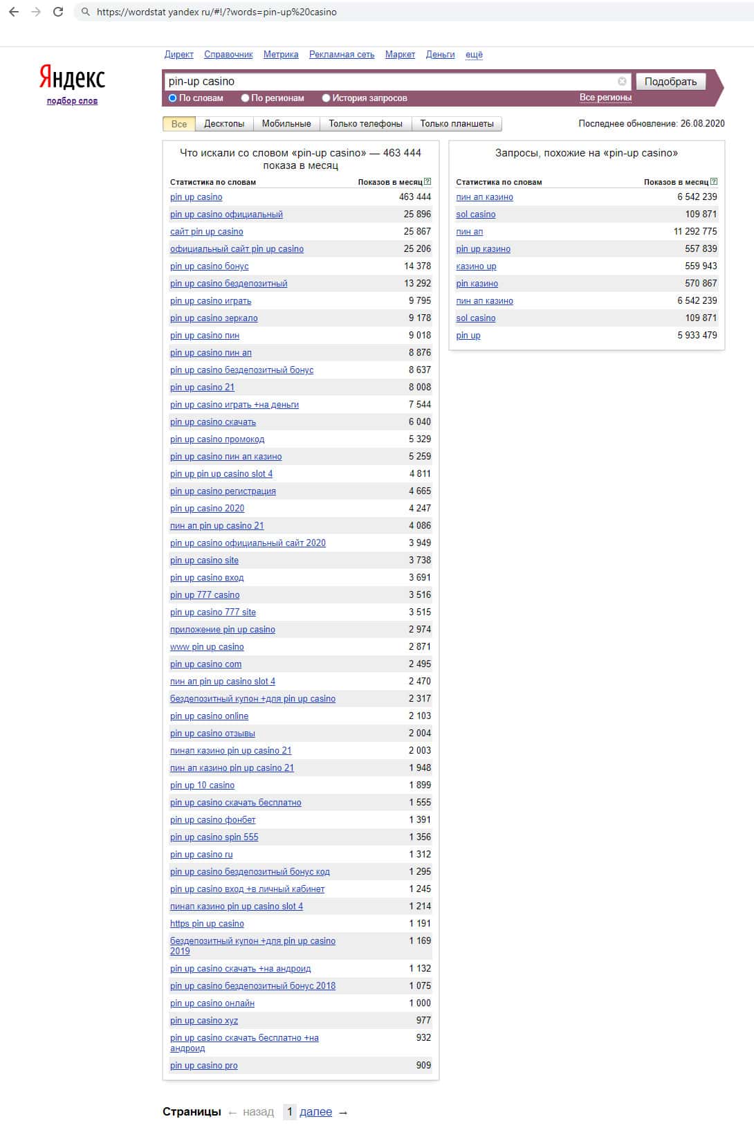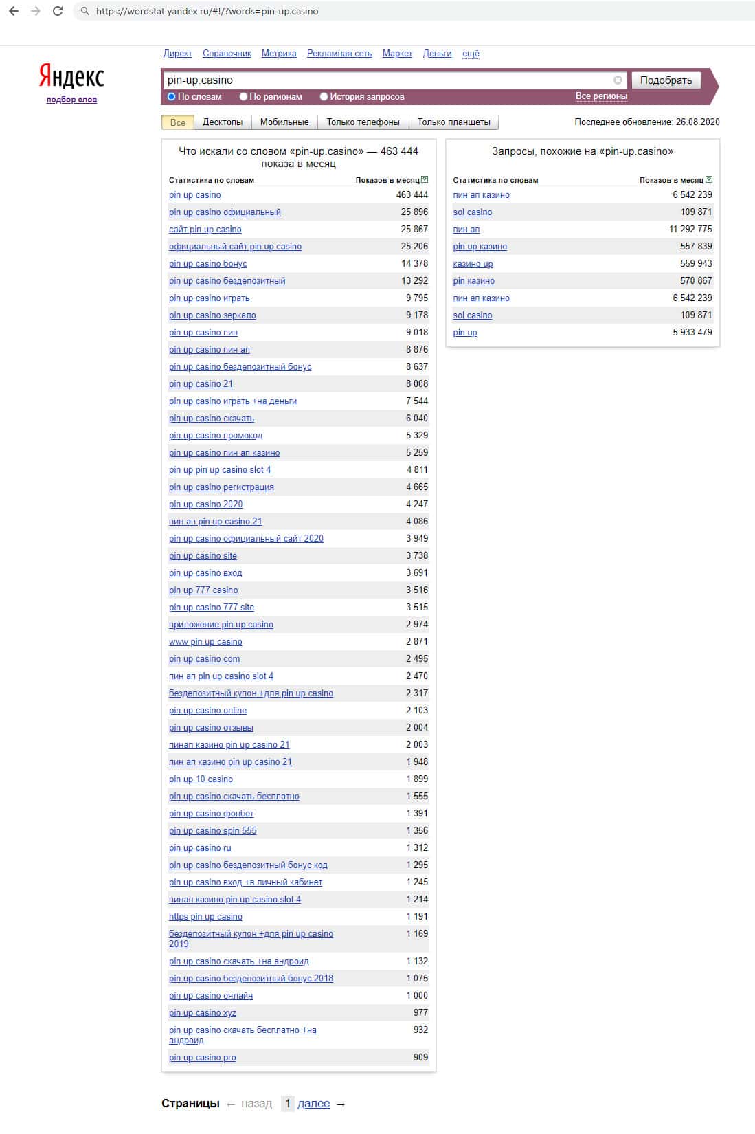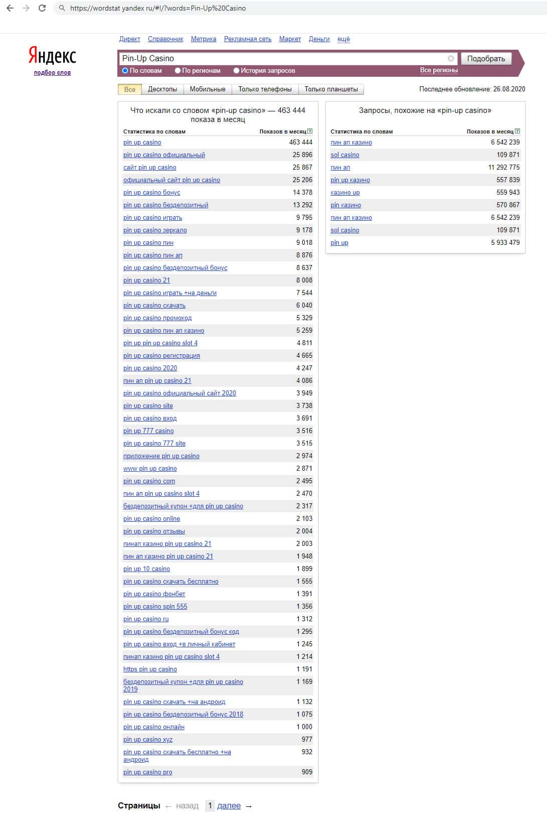 Мы проверили количество запросов компании кидал Pin-Up Casino в Яндексе по названию фирмы, а именно "Pin-Up Casino". Пользователи выполнили запрос 463444 раз.