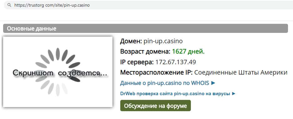 С помощью интернет ресурса "Доверие в Сети" мы проверили возраст компании финансовых кидал Пин Ап Казино, оказалось, что фирма существует более четырёх лет.