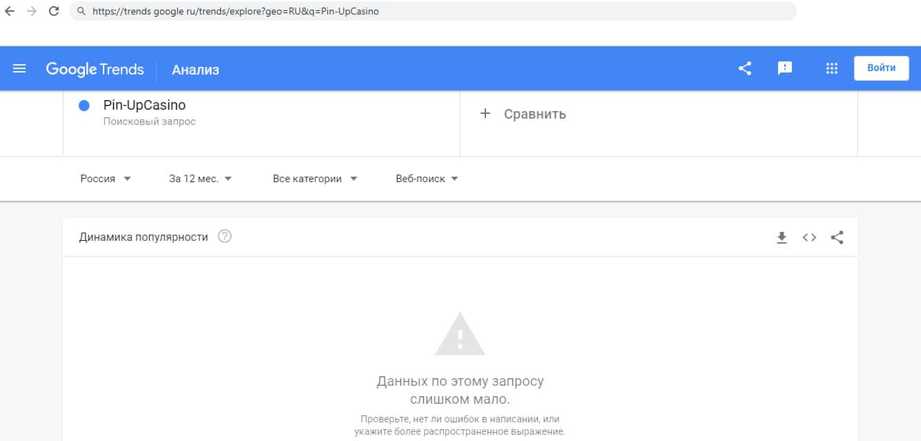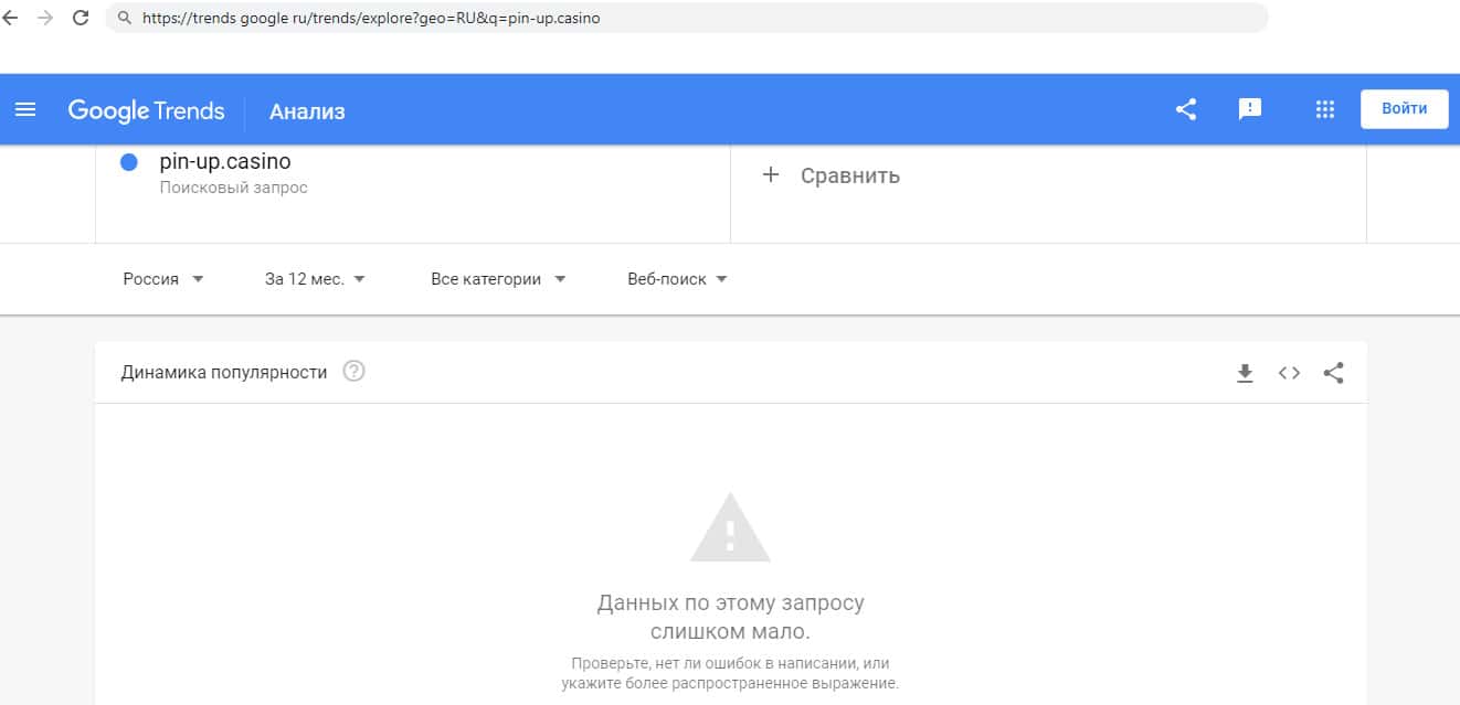 Проверили мы и количество запросов недоконторы Пин Ап Казино по русскоязычному названию без пробелов, а именно "ПинАпКазино". Но данный запрос пользователи не совершали.