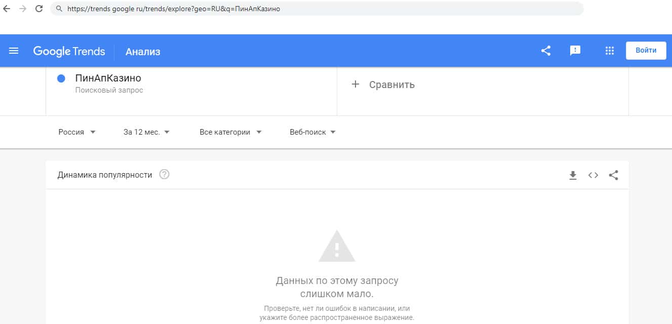 Решили мы проверить и запросы разводил Пин Ап Казино по русскоязычному названию без пробелов, а именно "ПинАпКазино". Пользователи не совершали данный запрос.
