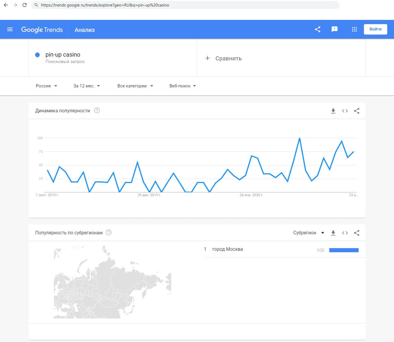 Мы так же проверили запросы недоказино Пин Ап Казино по русскоязычному названию с одним пробелом, а именно "ПинАп Казино". Большая часть запросов выполнялась именно с Москвы.