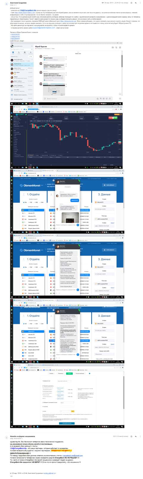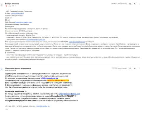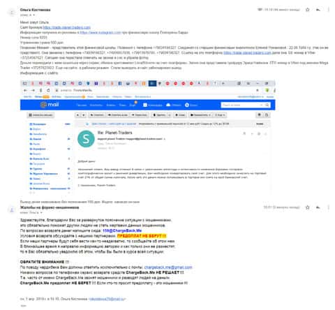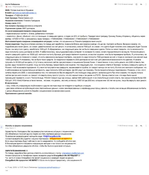 Схема была довольно простая, в которой женщина потеряла порядка 5000 рублей. Аферисты Планет Трейдерс выманили у нее деньги, но потом ее аналитик стал увиливать от ответов по поводу вывода денег. Он сказал, что вывод будет доступен при наличие 100 долларов на счете, а было только 75 долларов. Буквально за пару часов он слил все деньги. Пострадавшая отправила все подробности в компанию ChargeBack.Me где во всем разобрались и пообещали помочь.
