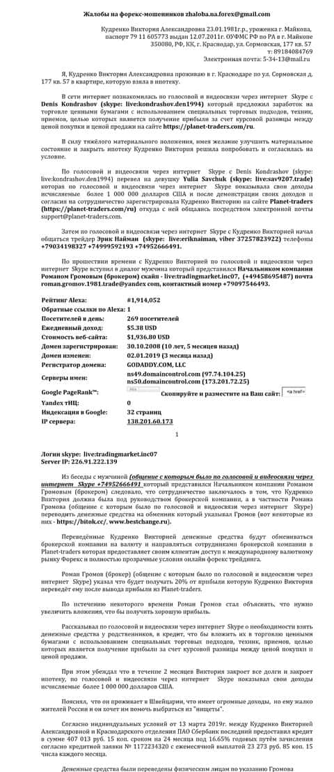 В данной жалобе описано целое уголовное дело, которое заведено против мошеннической конторы Планет Трейдерс. Опрокинутый клиент полностью в подробностях описал как действуют эти мошенники, а также указал все данные о каждом лице, которое причастно к схеме кидалова.