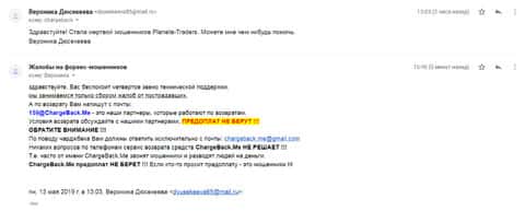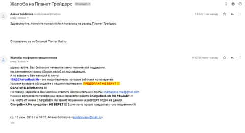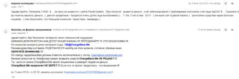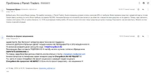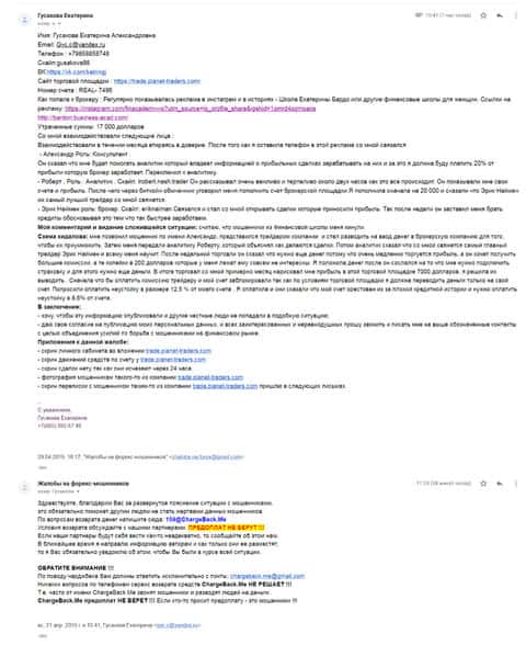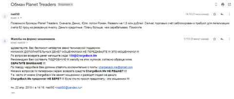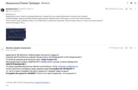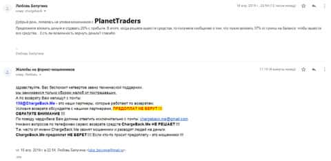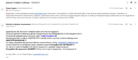 Следующая жалоба на аферистов Планет Трейдер размещена далее. Пострадавшему клиенту данного forex-лохотрона посоветовали обратится в специализированную службу ChargeBack.Me где возможно помогут человеку вернуть утраченное.