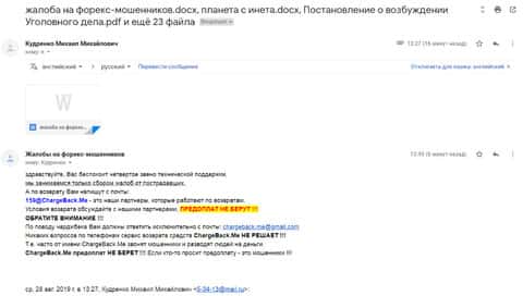 Далее представлено письмо, в котором опрокинутый клиент кухней Планет Трейдерс прикрепил копию уголовного дела, которое завели на этих аферистов.