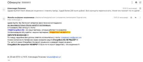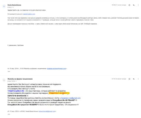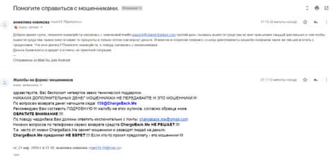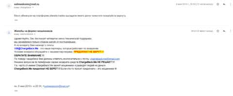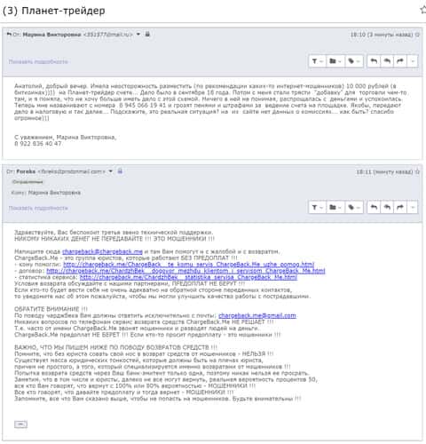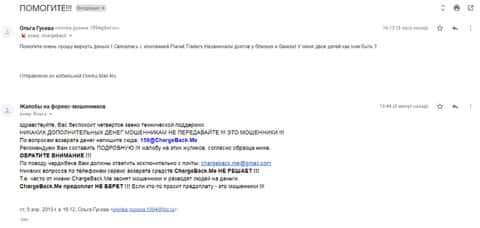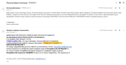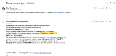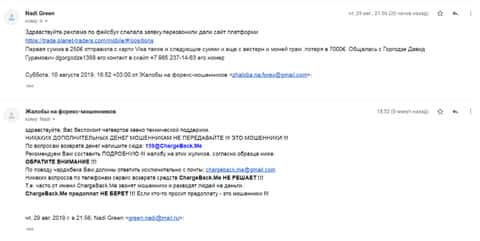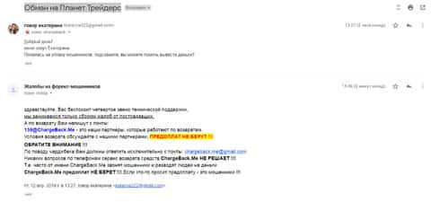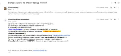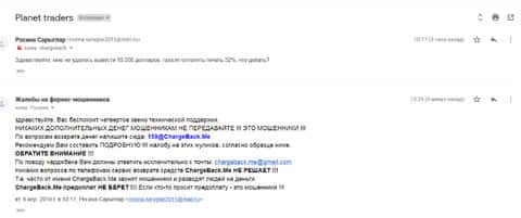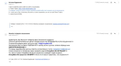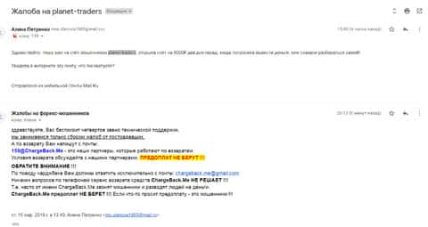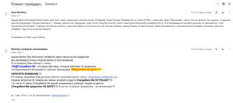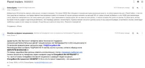 Женщина рассказала историю, в которой она связалась с шулерами Планет Трейдерс. Мошенники раскатали ее на 10 000 рублей, а когда она пыталась вывести хотя бы часть денег, то тут же ее стали игнорировать. Благо, что она нашла в интернете контакты одного интернет-ресурса под названием ChargeBack.Me где сталкивались с подобными случаями и довольно успешно их решали.