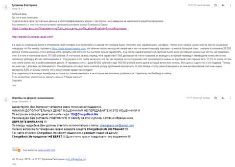 Здесь ситуация вообще очень интересная, так как человек попал в контору Planet Traders из рекламы про финансовую школу Екатерины Бардо. все началось со звонка жулья, который стал разводить на внесение 500 долларов. Когда деньги были переведены, никто на связь больше не выходил, а личный кабинет был заблокирован. По совету интернет-пользователей жертва кидка обратилась в компанию ChargeBack.Me за помощью.