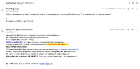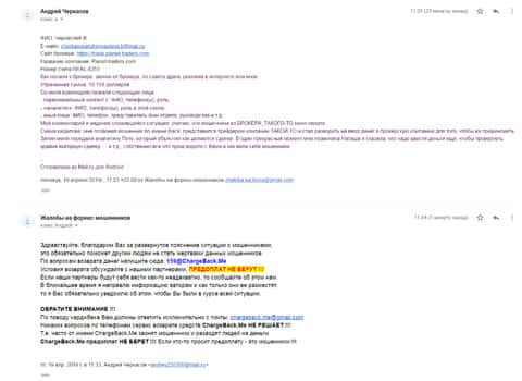 Еще один случай произошел с человеком, который доверился аферистам из форекс-лохотрона Планет Трейдерс. Шарлатаны пытались даже взять кредит на полмиллиона рублей, но удалось выманить только 800 долларов. Жулики отказывались отдавать даже эти деньги. И тогда он обратился в компанию ChargeBack.Me которая занимается возвратом средств из подобны контор.
