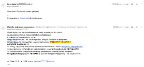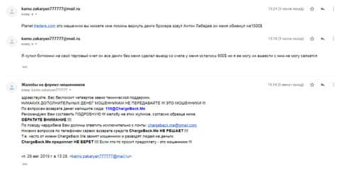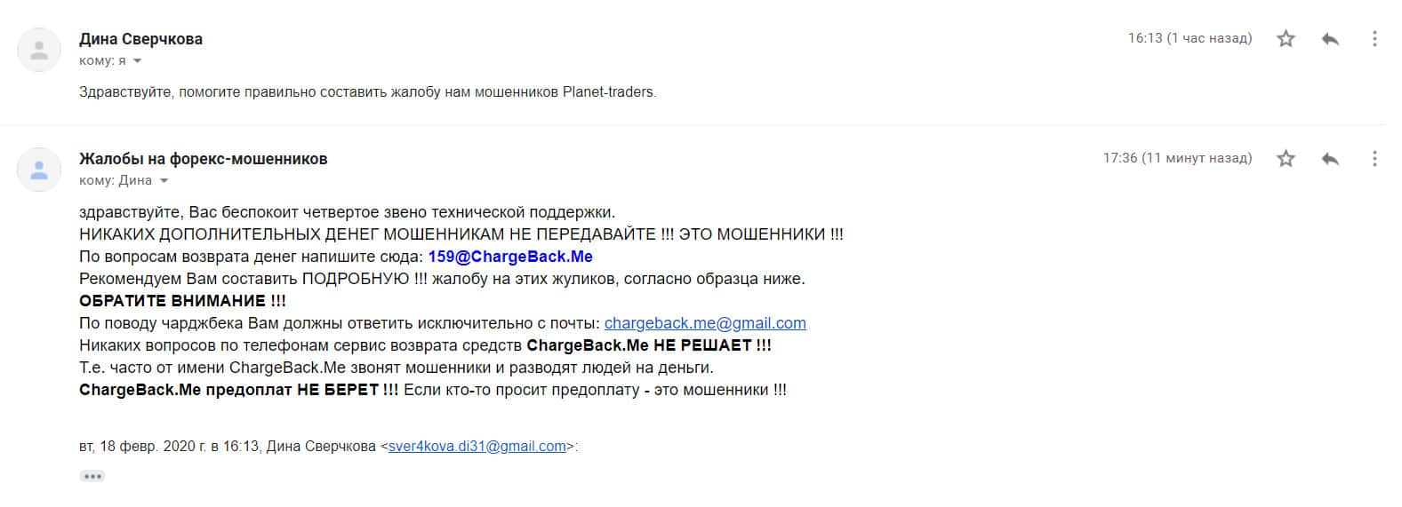 Уже третий день человек пытается вывести деньги из форекс-шараги Планет Трейдерс, но все никак даже не может связаться с ними. Деньги, которые жертва вложила были кредитными, поэтому возврат средств это вопрос жизни и смерти. Если бы не организация ChargeBack.Me то вряд ли были шансы на благоприятный исход ситуации. Почта с которой жулье общалось с клиентом support@palnet-traders com