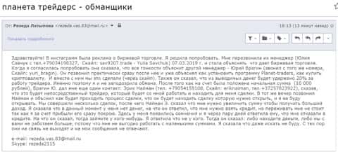 Еще один развод на деньги в ПЛАНЕТ Трейдер - клиентка пишет об утрате 13000 рублей