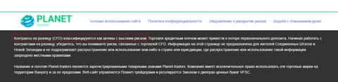 Заканчивает сайт подвальных мошенников Планет Трейдерс стандартный для таких дешёвых сайтов перечень ссылок и предупреждение о рисках. Из самого предупреждения о рисках аферистов Planet Traders можно узнать, что шулера занимаются непосредственно заключением CFD контрактов на разницу, и не идет никакой речи об торговле форекс или чем то смежным. На изображении ниже вы можете увидеть окончание сайта жуликов Планет Трейдерс и предупреждение о рисках.