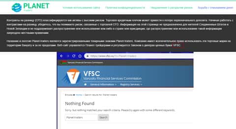 На сайте мошенников Planet Traders нету никаких упоминаний о наличии лицензии у жуликов. Данный факт уже заставляет усомниться в прозрачности деятельности аферистов Планет Трейдерс. Тем не менее шулера Planet Traders упоминают о том, что они регулируются VFSC. Данный факт можно расценивать как попытку жуликов Планет Трейдерс указать свое место регистрации, ведь о нем не упоминается ни на одной из страниц сайта. Однако на официальном ресурсе регулятора VFSC нету ни одного упоминания об жуликах Planet Traders. Данный факт вы можете увидеть на изображении ниже.