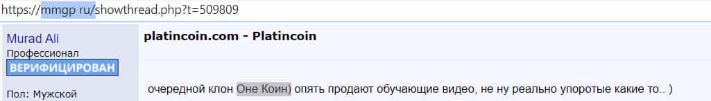 Автор далее идущего коммента пишет о том, что Платин Коин является скам проектом, лохотроном и финансовой пирамидой, которая очень сильно рекламируется на территории РФ и стран СНГ, и это привело к тому, что жертвами мошенничества компании PlatinCoin стали десятки тысяч людей.