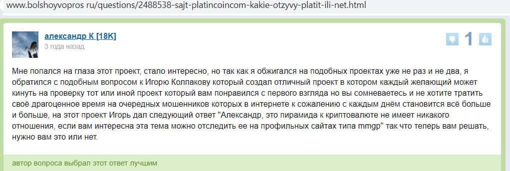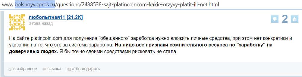 На следующей публикации можно ознакомится с очередным негативный отзывом о конторе Платин Коин, которая имеет все признаки сомнительного ресурса по "заработку" иными словами PlatinCoin является откровенно мошенническим проектом, поэтому стоит обходить стороной данную организаци, которая создана с целью обмана доверчивых граждан.