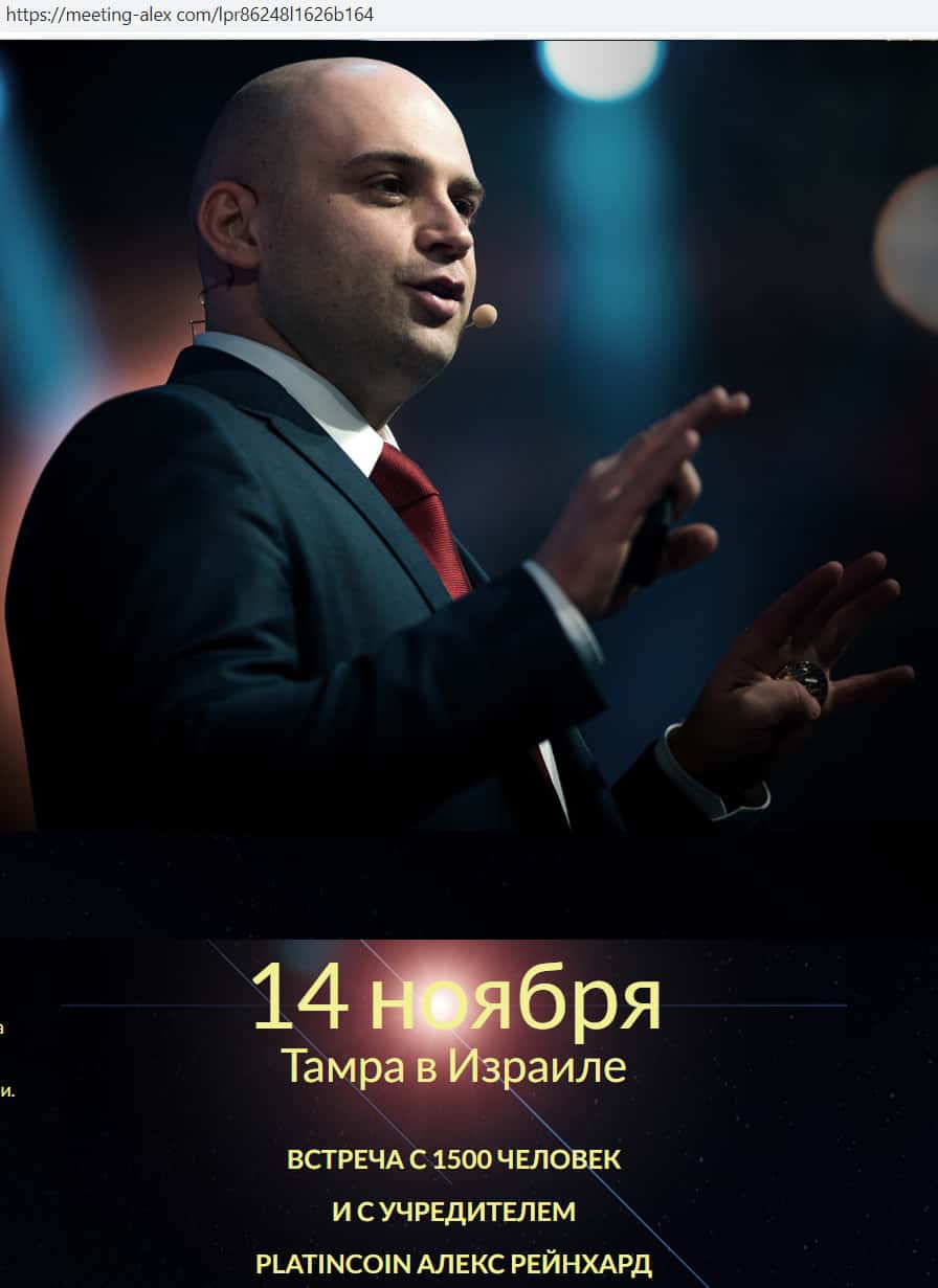 Онлайн-ресурс Меетинг Алекс Ком является еще одним сайтом, задействованным для облапошивания людей, которым рассказывают сказки о заработках, призывая покупать криптовалюту лохотрона Платин Коин, на данном сайте рекламируют мероприятия, где собственно и занимаются втягиванием потенциальных жертв мошенничества в финансовую пирамиду, и занимается этим также один из учредителей конторы, Алекс Рейнхард.