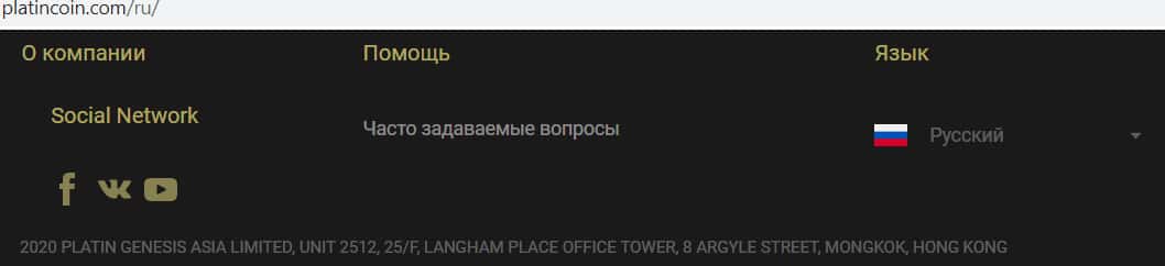 Жульническая организация PlatinCoin, являясь типичным крипто-лохотроном, не имеет номеров телефона, офиса в РФ, все чем может воспользоваться будущая жертва аферы, так это связаться с жуликами в социальных сетях, либо не задавая лишних вопросов, просто отправить сразу же средства мошенникам на счет. Из того, что есть на сайте Платин Коин, так это адрес места регистрации конторы в Гонконге.