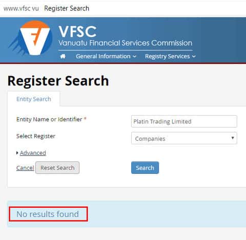 Чтобы понять это нам нужно лишь полное название шарашкиной конторы Platin Trading и реестр компаний оффшор-государства Вануату. Введя название шарашки в поиск, мы не нашли о ней никаких сведений. Поддельность единственного реального документа видна как никогда.