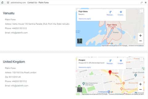 Просмотрев раздел контактов на Интернет-ресурсе разводил Platin Trading, мы можем видеть что оба из них – липовые. Ни адрес в Вануату, ни тем более адрес в Лондоне не имеют никакой связи с шарашкой Платин Трейдинг. Данные контакты приведены ниже: