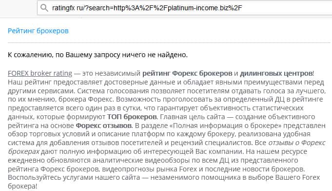 На сайте довериевсети рф всегда можно посмотреть оценку деятельности того или иного брокера. очень легко там вычисляются мошенники. Особенно, когда они заявляют, что много лет находятся на рынке, а их домен существует не более полугода - стандартная история. Уже по одному этому факту можно сделать выводы. Также на сайте нет оценок от людей конторы Platinum-Income. Значит они все подчищали.