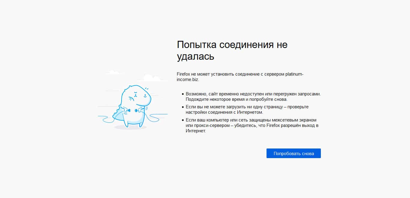 Теперь, когда вы зайдете на сайт помойки Платинум Инком, то обнаружите там только вот такую вот картину. Потому что жулики его прикрыли вместе со своим проектом. Никаких данных о нем не осталось. Проект изначально был задуман, как однодневка, поэтому тут просто нечему удивляться.