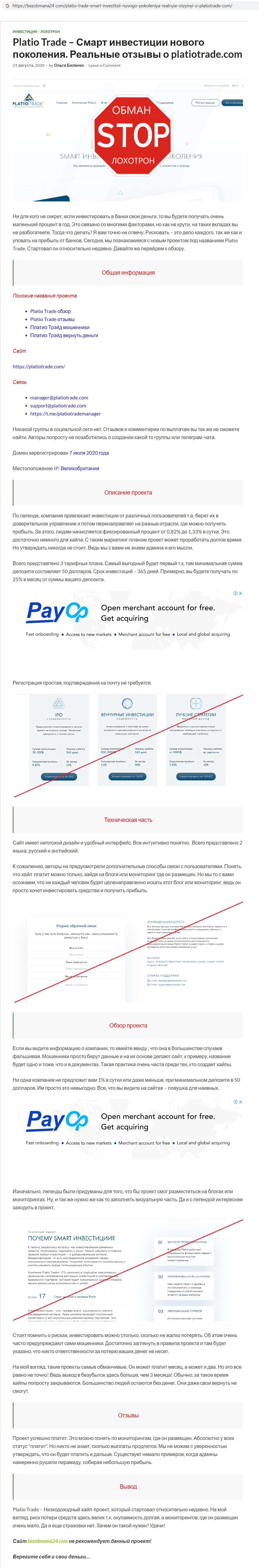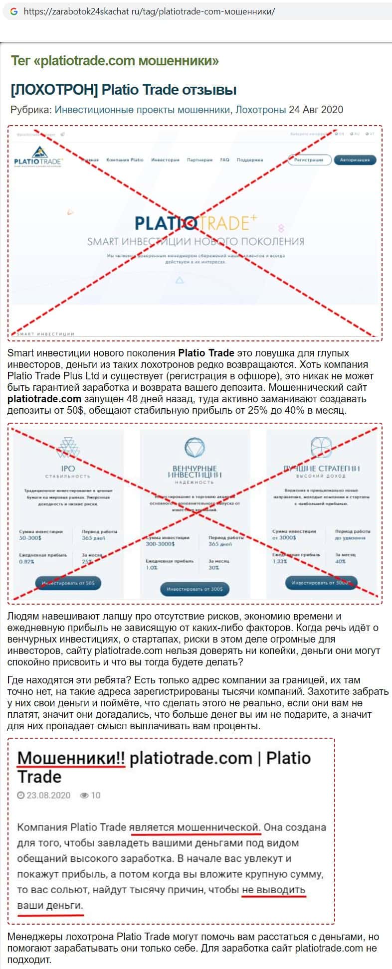 Интернет ресурс zarabotok24skachst ru опубликовал статью, в которой назвал компанию PlatioTrade мошеннической, так как фирма просто напросто разводил клиентов на денежные средства.