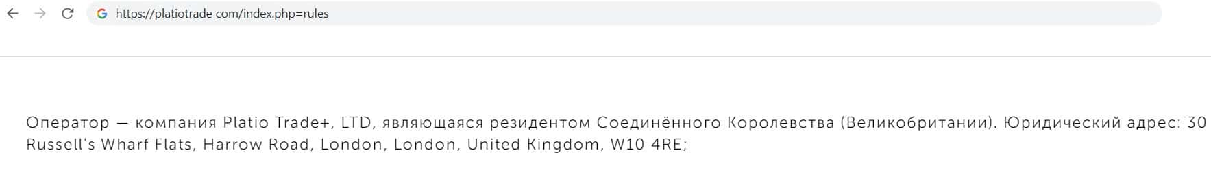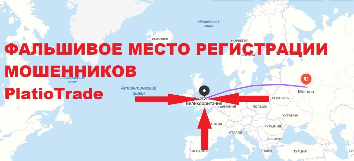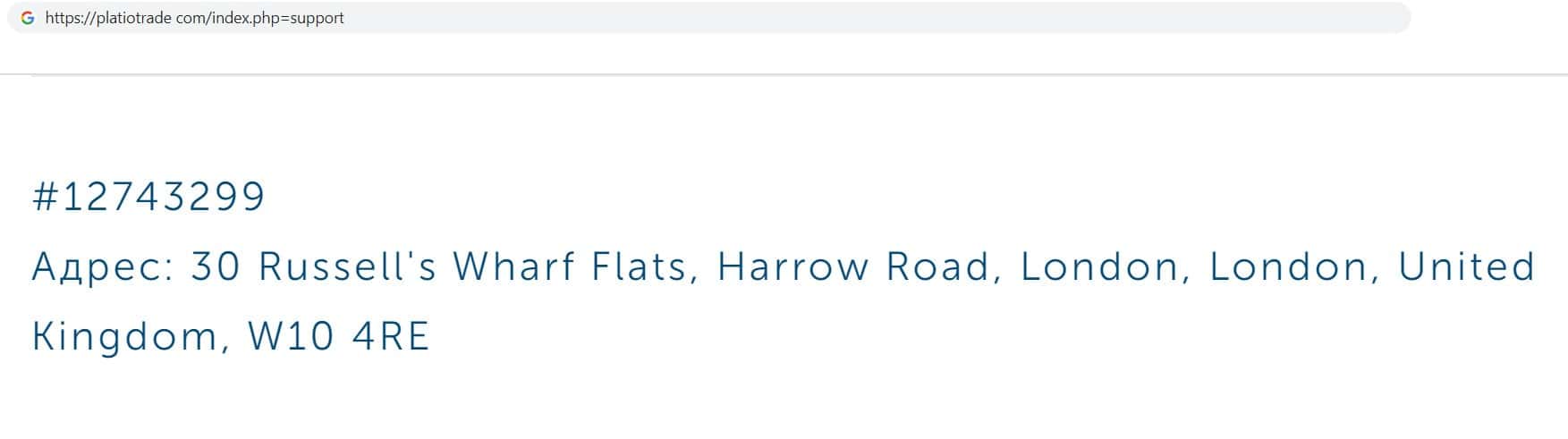 Мошенническая организация PlatioTrade указала, что зарегистрирована в Великобритании, но конечно же это фальшивая информация, так как жулики указали ложный адрес.