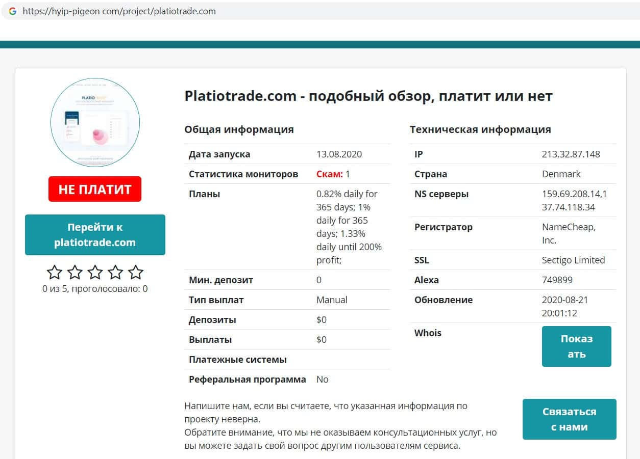 Ещё на сайте hyip-pigeon com мы нашли информацию о проекте разводил Платио Трейд, в которой сайт подтверждает, что данная компания жуликов никаких средств своим клиентам не выплачивает.